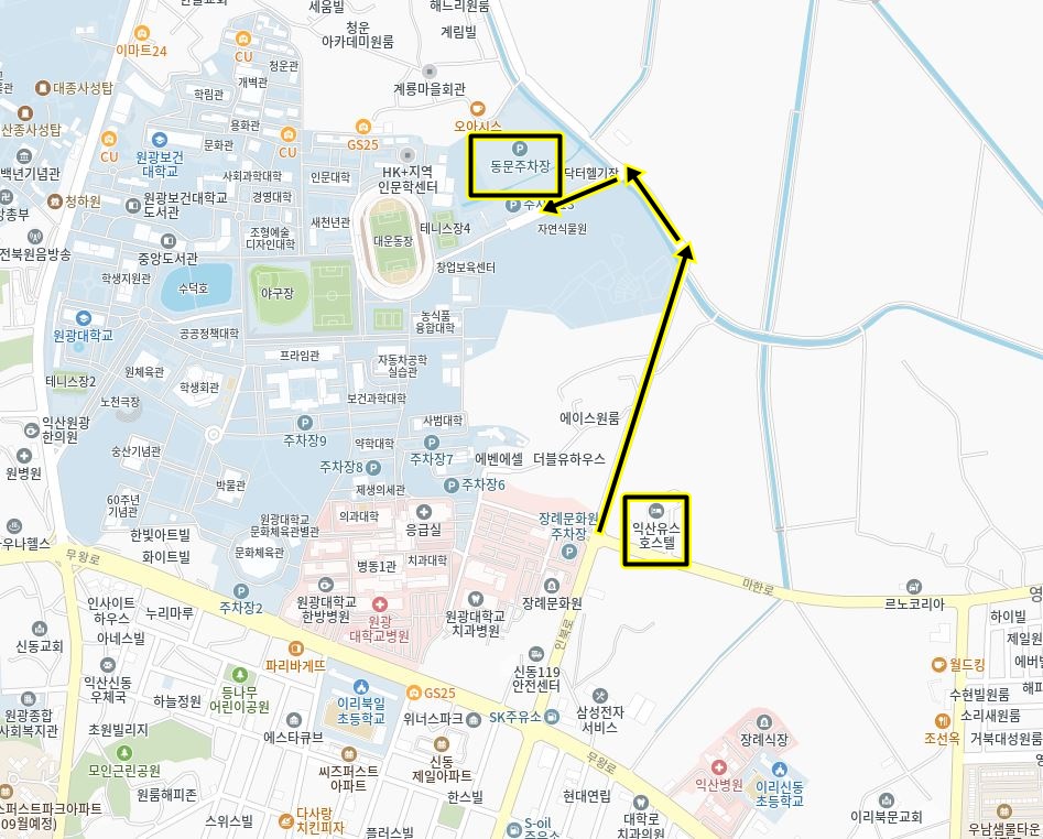 - 무료 주차는 닥터헬기장이 있는 원광대학교 동문주차장에 하시면 됩니다.