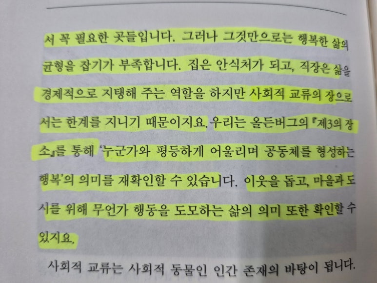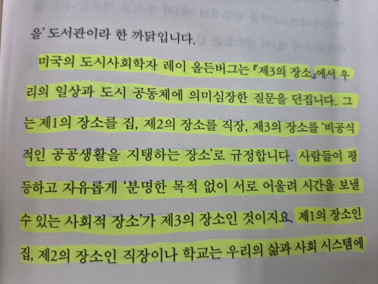 책에서 김승수 전 시장님은 '서학예술마을도서관'이 서서학동 주민들의 사회적 교류의 장 역할을 하는 제3의 장소(제1의 장소인 집은 안식처가 되고, 제2의 장소인 직장은 삶을 경제적으로 지탱해 주지만, 제3의 장소는 사회적 교류의 역할을 한다)가 되기를 바라는 마음을 담았다고 적었는데요.