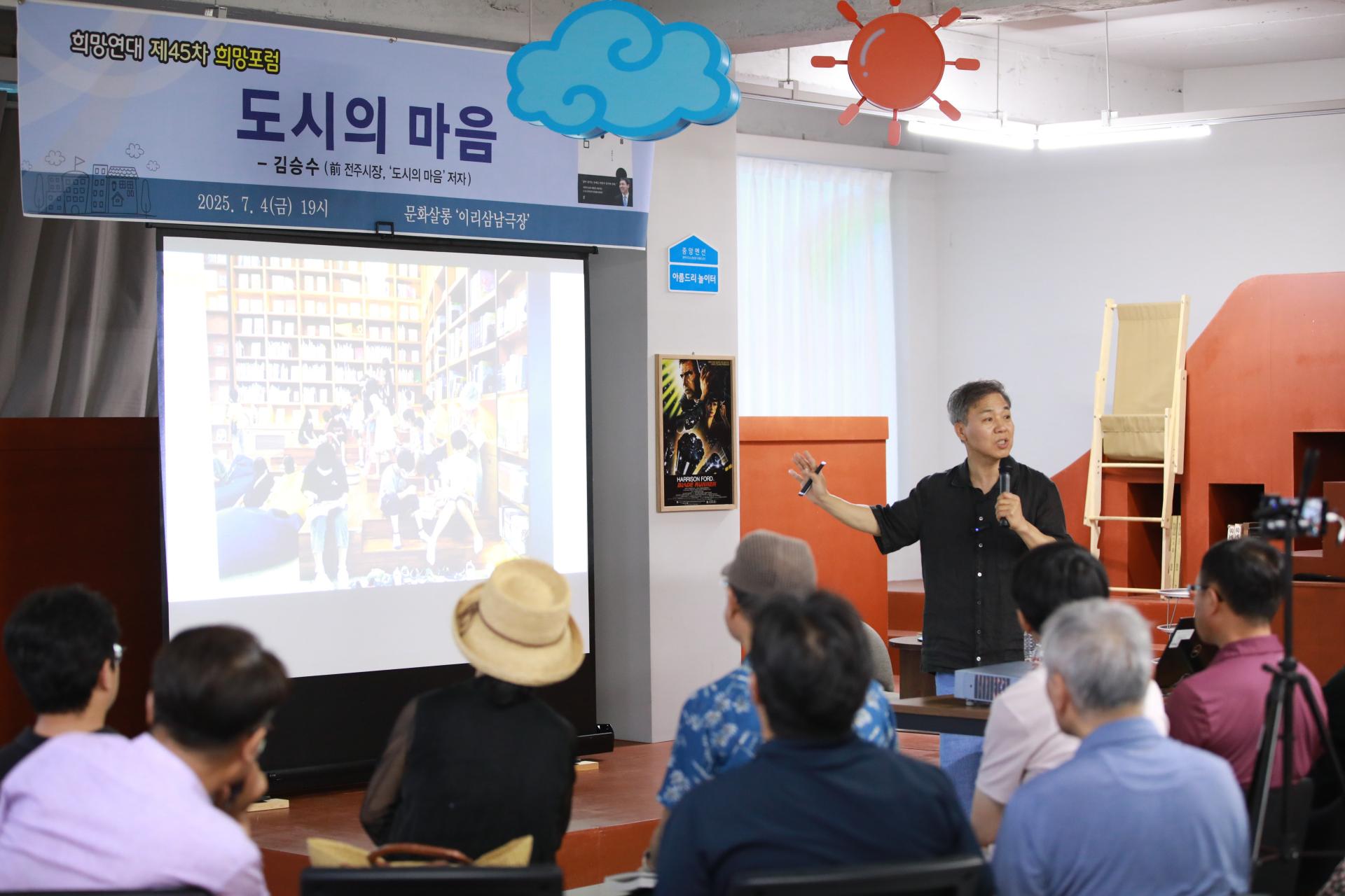 2025년 7월 4일 저녁 7시, 익산시 중앙동 원도심에 위치한 '문화살롱 이리삼남극장'에서 희망연대 주최로 제45차 희망포럼이 열렸습니다.